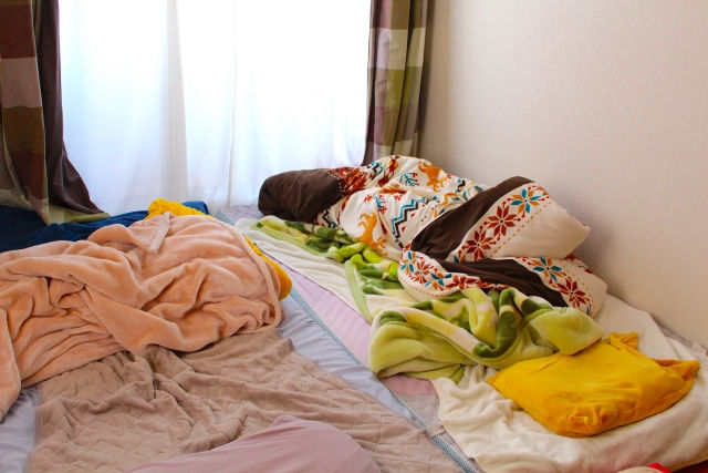 万年床、床に物が置かれている状態、